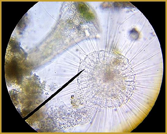 This photo opportunity lasted only a few minutes. Shortly after I took this picture the Stentor in the upper portion moved to face in a different direction, and the Amoeba in the lower left portion slithered away. Only the Actinosphaerium remained to suck on the piece of protoplasm that it had skewered - the out-of-focus blob between the Amoeba and the pointer. Neither of these three Protozoa were a threat to one another. The Stentor feeds on bacteria and algae, and the Amoeba eats whatever it can engulf and digest. The Actinosphaerium couldn't handle the size of either one.
