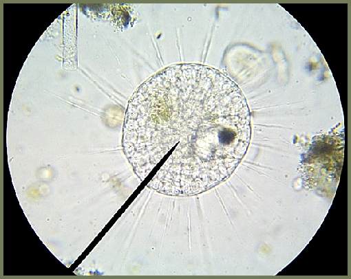 The white spot just to the right of the pointer tip is a food vacuole. The dark spot within it is the latest meal being digested. At about 9:00 or 10:00 is an out-of-focus yellow food morsel that has been impaled on one of the Actinosphaerium's spikes. That's the unfortunate next meal. At about 2:00 is an out-of-focus Vorticella that wandered by. The Actinosphaerium seemed unconcerned, and the Vorticella moved on.