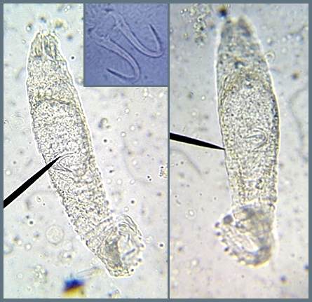 Because this worm was alive, it was wriggling non-stop and the images are a bit blurred, but clear enough to see the head parts. On the picture at the left, just at the tip of the pointer, you can see the two retracted "fish hooks" in the abdomen area, the appendages that extend beyond the head and attach to the fish. These hooks securely anchor the worm to the fish, and are the reason they must release before trying to remove the worm. A dab of turpentine is usually good enough to cause the worm to release its grip. A knife can then be used to scrape the mucous containing the micro fluke from the fish's body. The smaller appendages surrounding the mouth are the sucker parts.