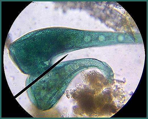 It's a pair of aquamarine colored Stentor, much like the common brown ones I see by the thousands in my pond filter sponge. Finding a colored pair is a rarity in a backyard fish pond, eventhough there are several colored species. The green color tone in this pair is probably due to the presence of symbiotic green algae. These two protozoa are really no different than any of the other Stentor species. The only difference is their vivid coloring. These two are not really a "pair". They multiply simply by sprouting a new "bud" from the side of the body.