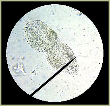 Paramecium increase their numbers by a process known as "binary fission", the simplest of the reproductive processes of Protozoa. The Paramecium pictured here will split into two, and each one might again divide by the end of the day.