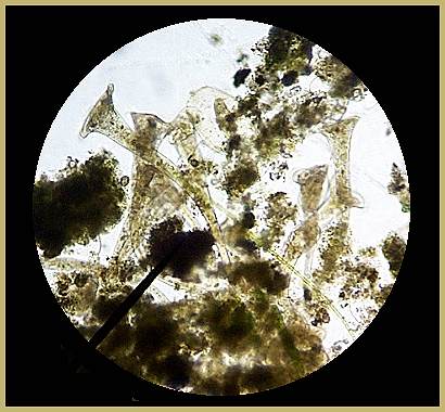 After squeezing the sponge from my pond filter and collecting the juice, I let it sit undisturbed until the oxygen-rich muck settled to the bottom of the jar. I picked up an eye dropper full of the sediment and let the dropper sit upright for about 30 minutes. The Stentor settled to the bottom looking to attach themselves to a solid pond bottom. One drop of this sediment yielded more Stentor than I could count. Here's a "gaggle" of them from just one small area of a drop of the soup.