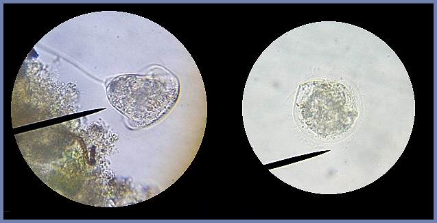 The Vorticella's stalk is fully extended and anchored as the creature sways back and forth, swirling bits of food into its mouth. Slightly below the black pointer is a brown-colored worm, the larva of one of the many midge-type flies. Shortly after this photo was taken, the worm began wildly whipping its body (that's how they move) and it inadvertantly cut the Vorticella's stalk. The picture at the right shows the critter rolled into a ball and wandering aimlessly. The stub of the stalk can be seen at the edge of the body, at about 10 o'clock.
