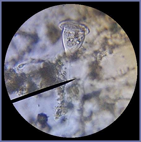 The stalk of the Vorticella extends back to about 15 times its body length. The sticky end allows the Vorticella to attach its stalk to suspended objects, or more likely, the pond bottom. The Vorticella then slowly patrols a circular area, sweeping food into its huge mouth. When startled, the creature instantly recoils to the point of its anchored stalk, then slowly extends itself once again.