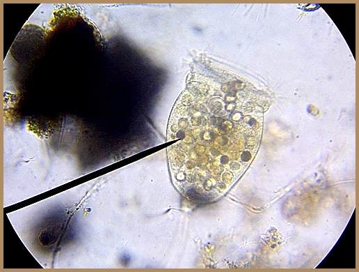 In this unusually clear image, we can see (faintly) the three rows of beating cilia that surround the anterior opening, the contractile stalk, the mouth, the (waste) water expelling vesicle, several food vesicles, macronucleus and micronucleus. All the parts needed to function as we humans do, but in just one cell.